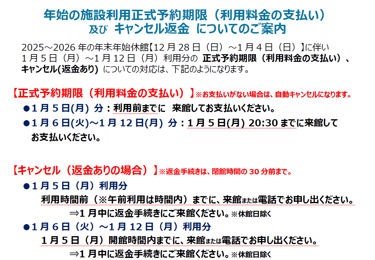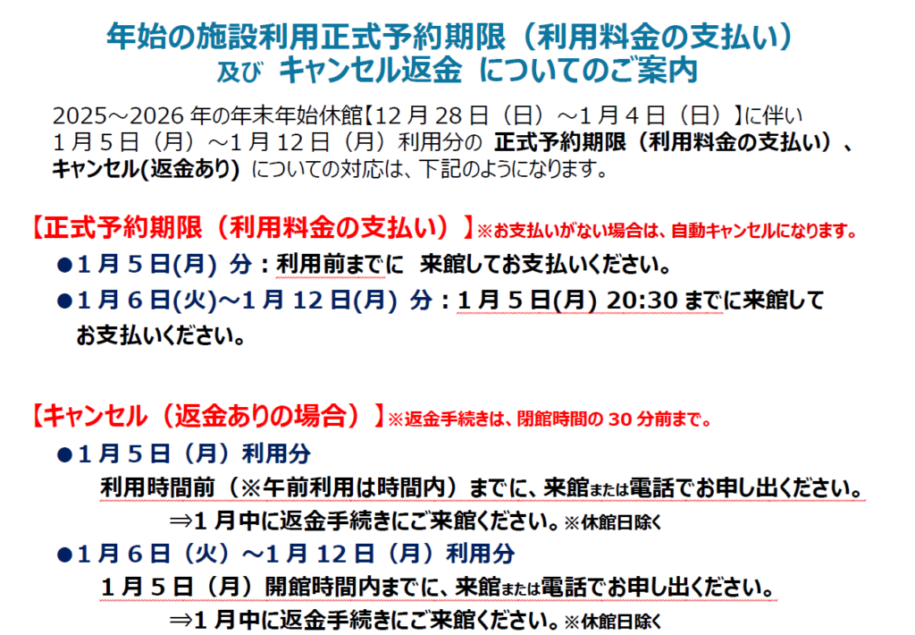 年末年始休館に伴い、年始のご利用分に関しましては下記のようになります。