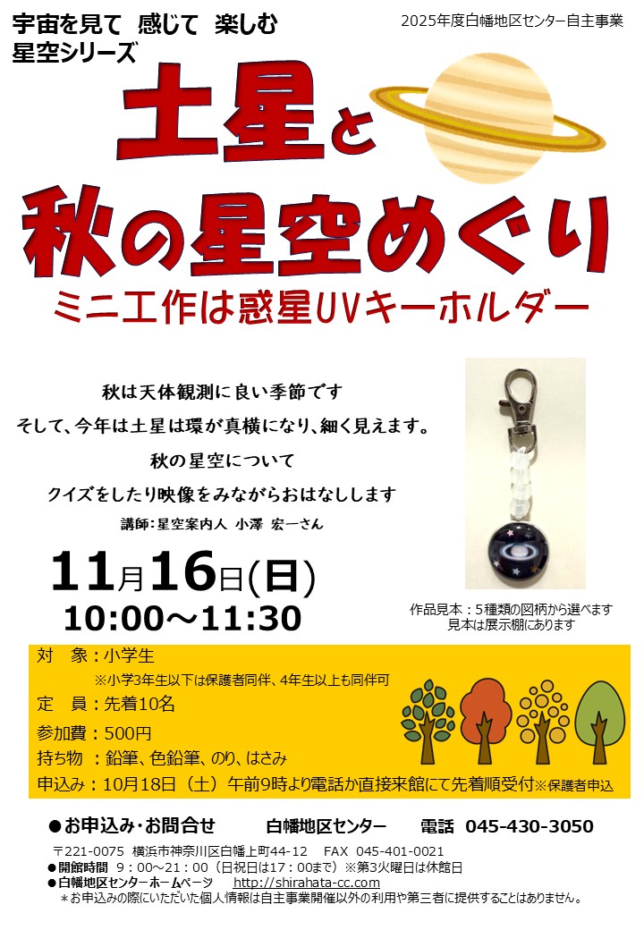 土星と秋の星空めぐり ~ミニ工作は惑星UVキーホルダー~【受付中】