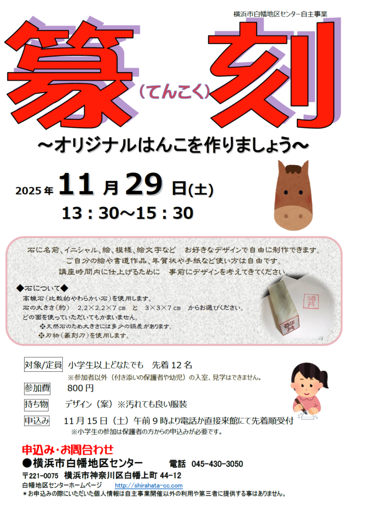 2025年11月15日(土)午前9時より電話か来館にて先着順受付をします。※小学生は保護者申込